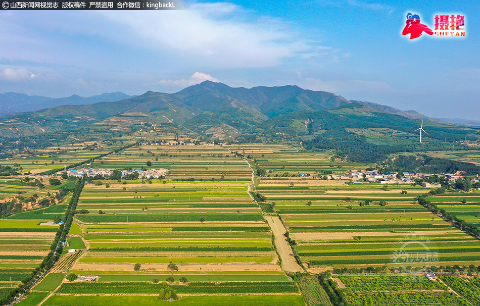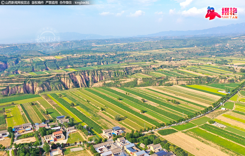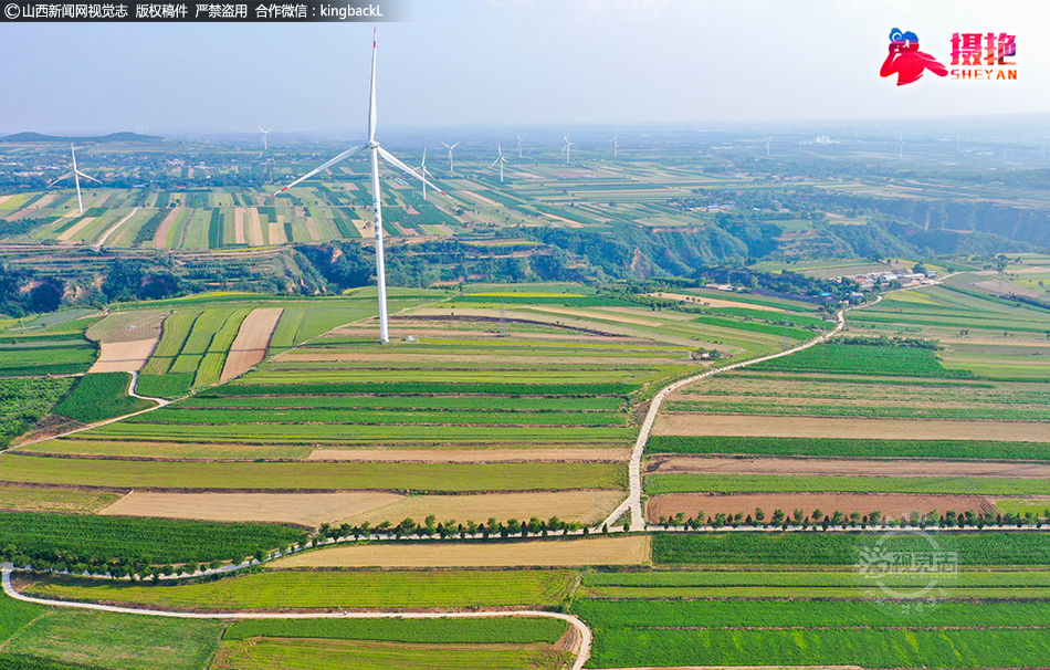 6月29日,运城市夏县庙前镇桑村岭上,梯田、沟壑、风电、道路、村居及远处青山相映成趣,勾勒出一幅秀美的绿色生态画图,蔚为壮观。