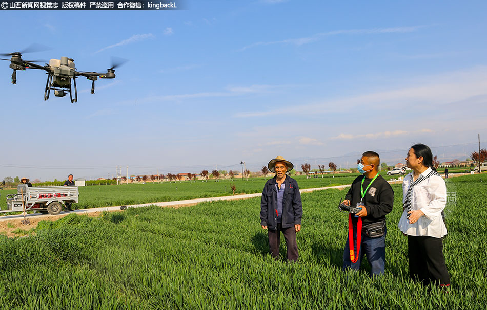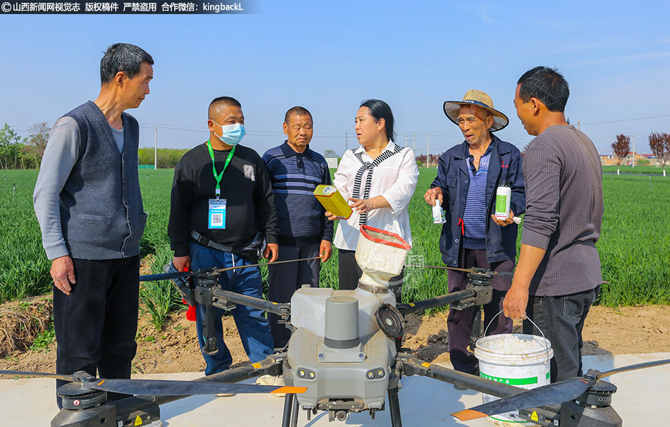 4月10日,夏县农业农村局高级农艺师李淑能在尉郭乡尉郭村一处高标准小麦示范园区指导农民做好当前小麦的管护工作。