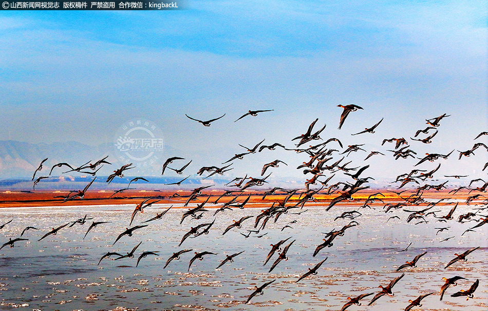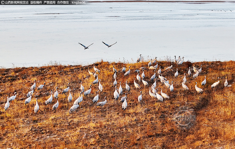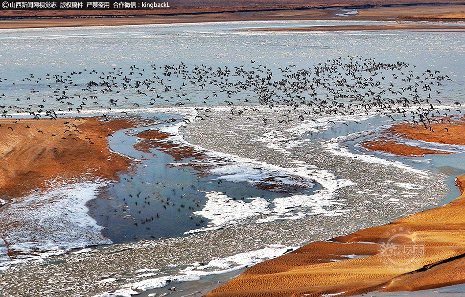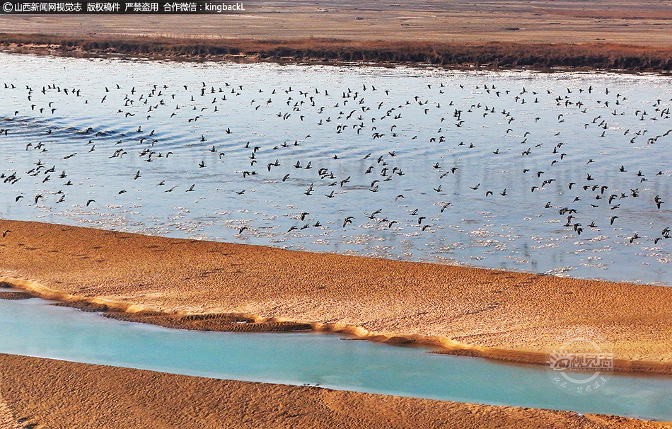 新年伊始,1月11日,万荣县黄河岸边,蓝天碧水,悠闲的灰鹤、高飞的候鸟、成群游弋的野鸭,构成了冬日里最美的景致。