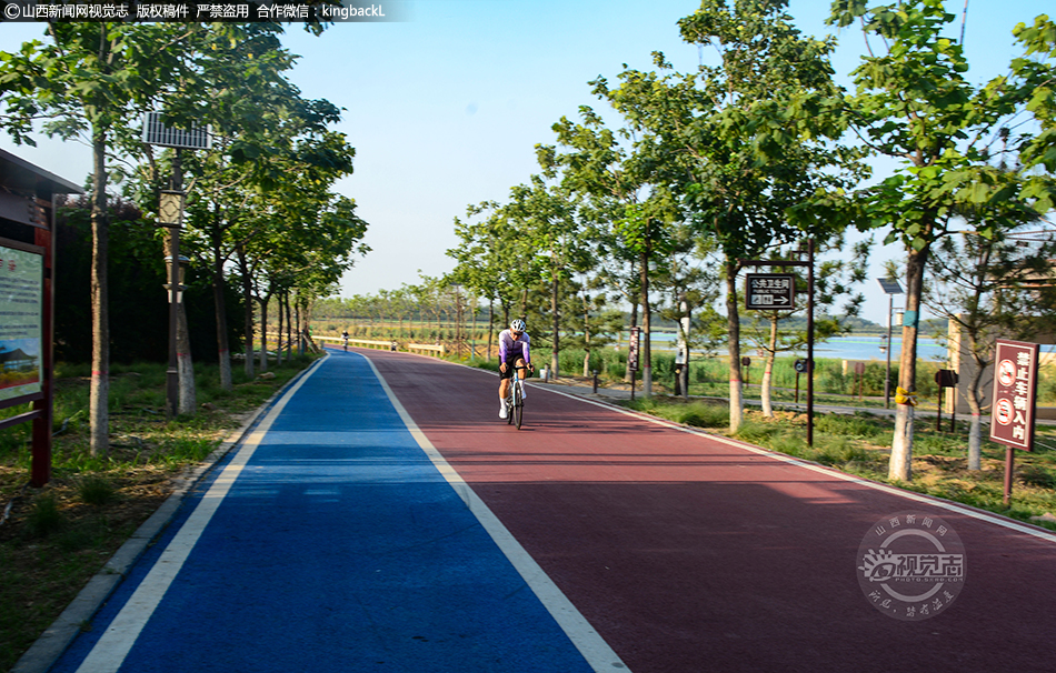 6月16日,永济市伍姓湖湿地公园里,游客们在惬意地游玩,拍照,骑行,享受炎炎夏日里湿地公园清凉生活。