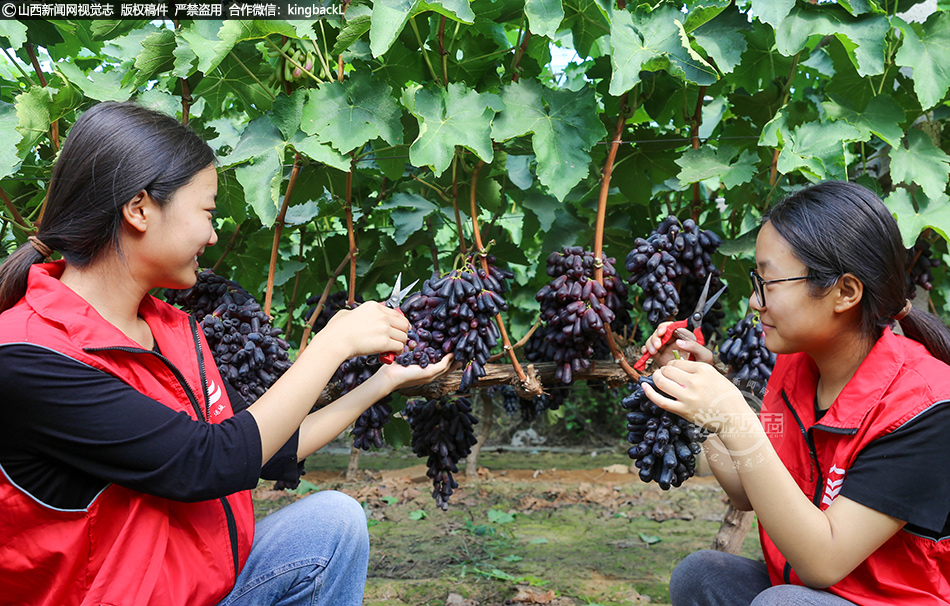 8月14日,在运城市夏县禹王镇郭里村,返乡双胞胎大学生韩雨芒、韩雨荷姐妹俩正在田间地头为家乡代言,直播销售葡萄,助农增收。