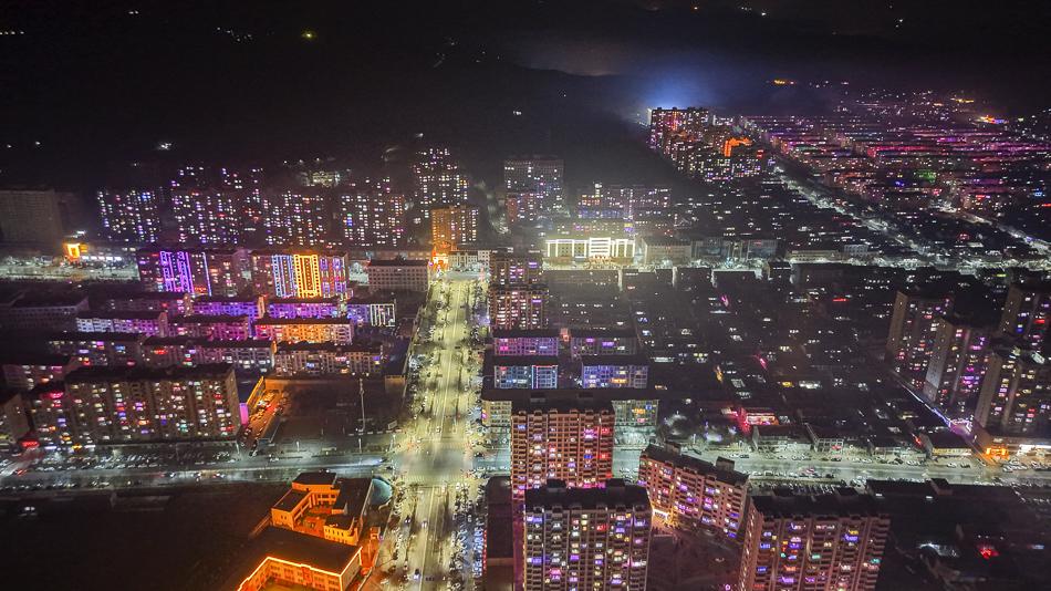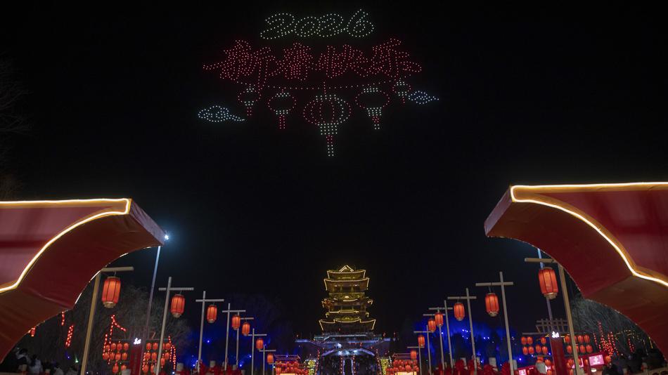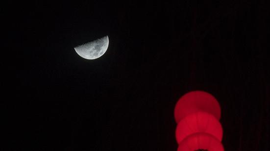 2026年度最大上弦月现身夜空。在山西省武乡县,新春彩灯与皎洁明月交相辉映,构成一幅亮眼的新春天象景观。