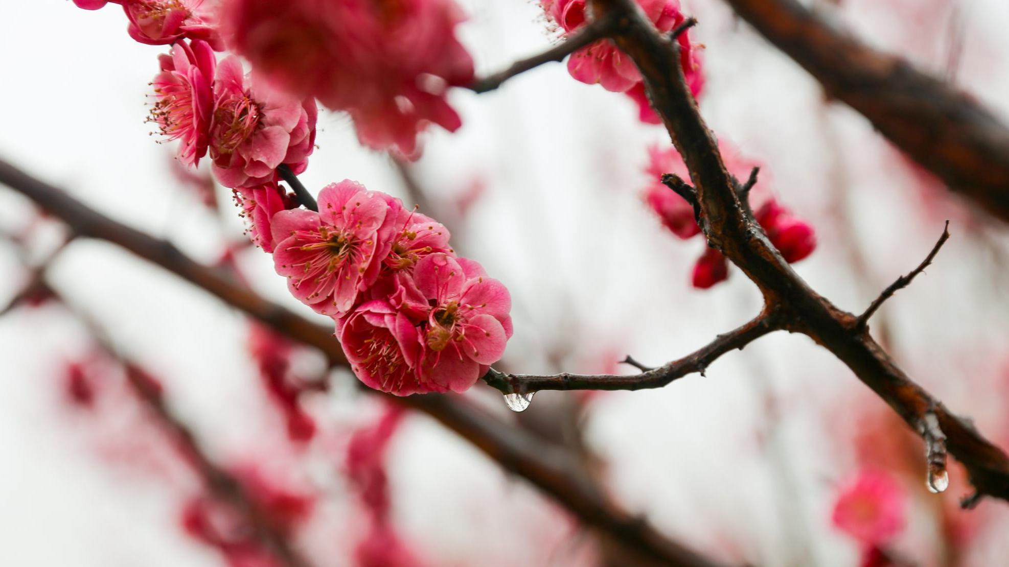 运城市盐湖区解州镇五龙峪公园内红梅竞相绽放,红粉相间、暗香浮动,与碧水、廊架相映成趣。