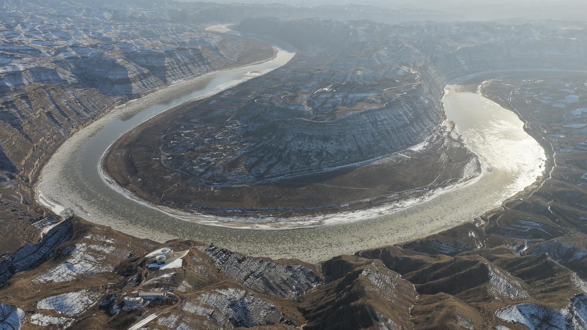 永和乾坤湾黄河现流凌景观 尽显黄河独有的冬日韵味