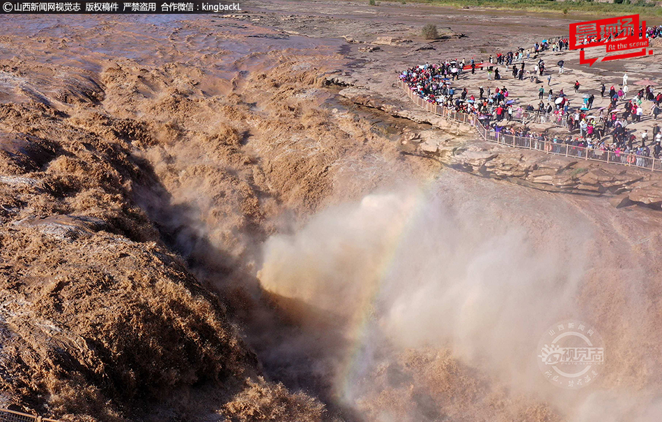 9月23日,游客在吉县黄河壶口瀑布景区游览观瀑。金秋时节,受上游降雨和水库调节放水影响,吉县黄河壶口瀑布水量大增,壮美奔腾景象吸引了众多游客前来游览。摄影师:吕桂明