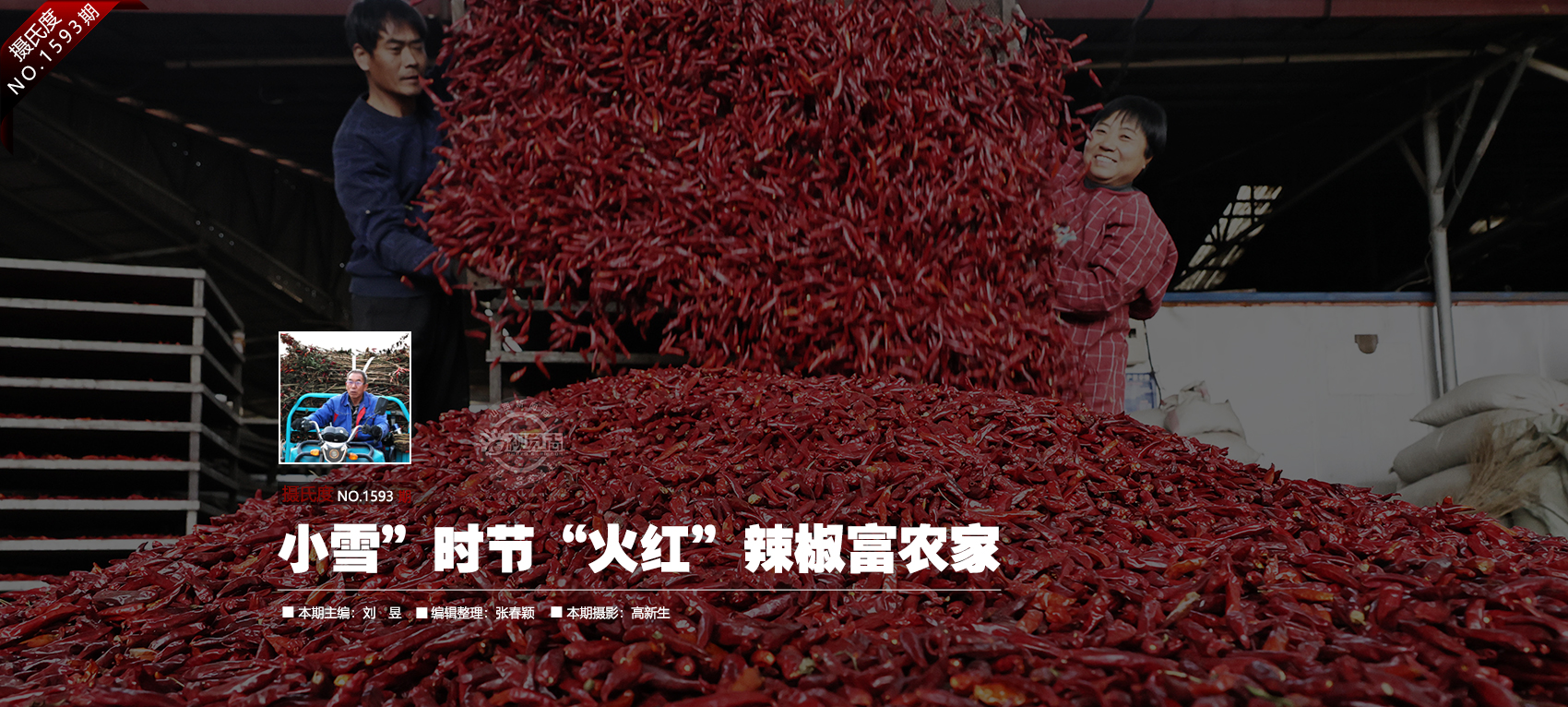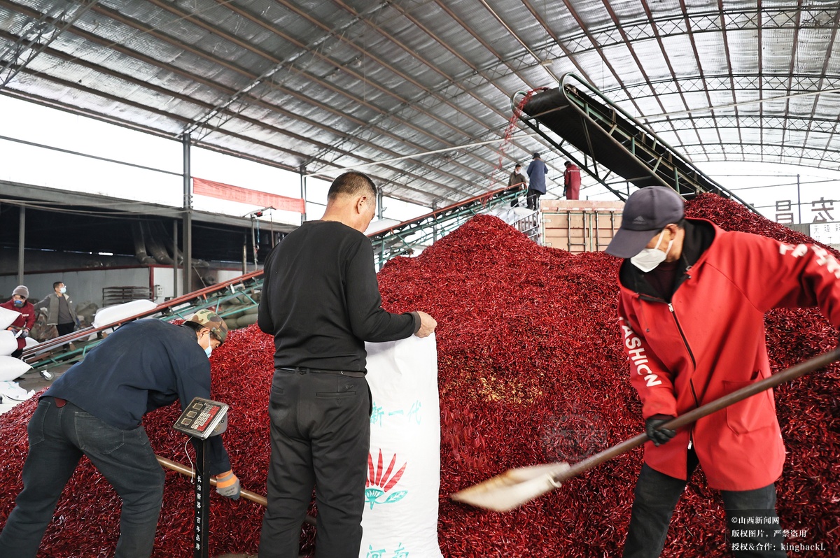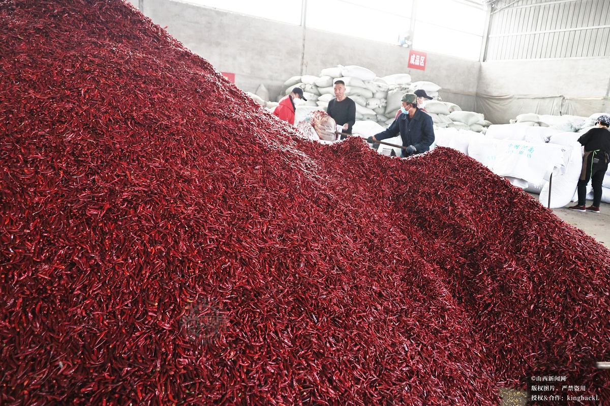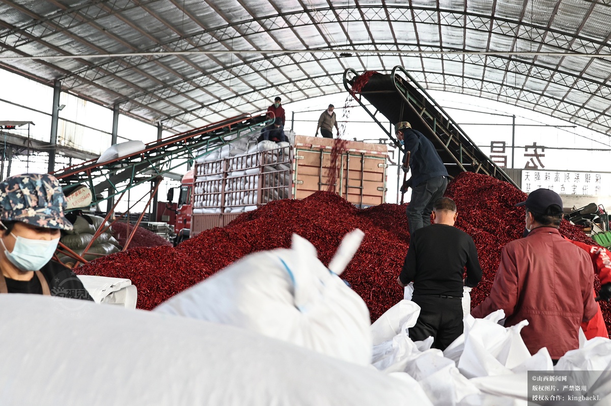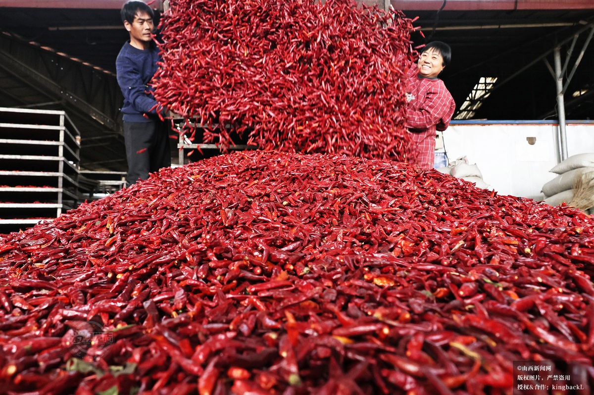 在赵雄村的各家辣椒专业合作社和辣椒农贸公司里,更是另一番热火朝天的景象,椒农在加紧装袋装车烘干的辣椒,准备外销。
