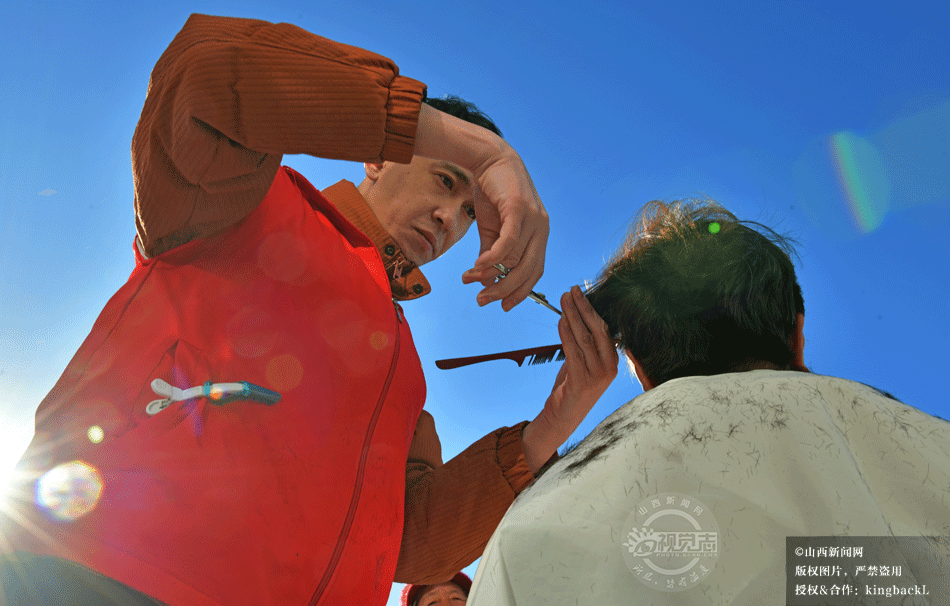 理发师志愿者手持剪刀,轻抚老人的头发,根据他们的喜好精心设计发型。