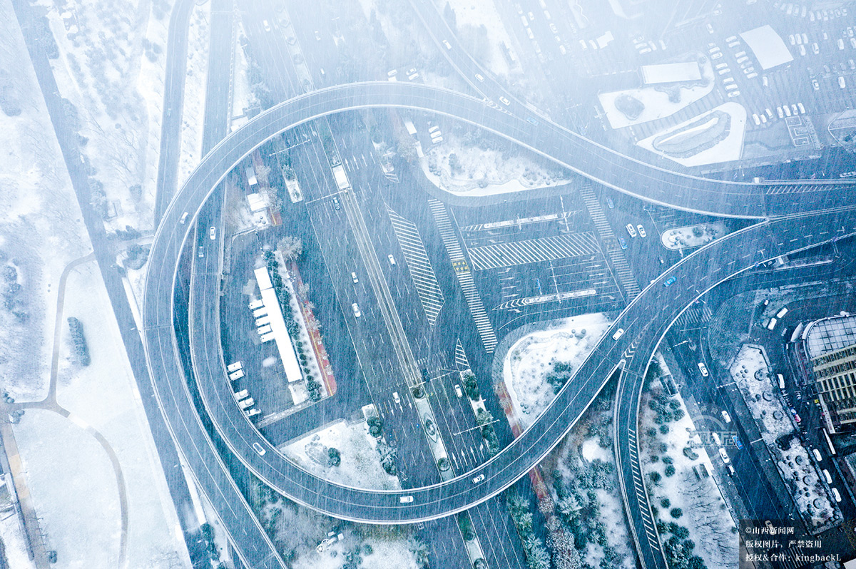 12月12日,拍摄于临汾市区。纵横交错的道路在雪中延伸。山西新闻网特约摄影师:苏亚兵