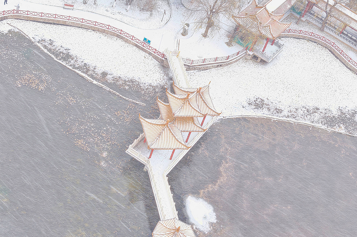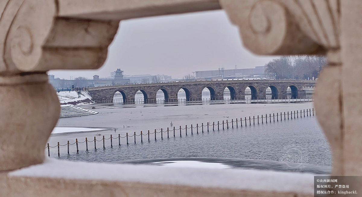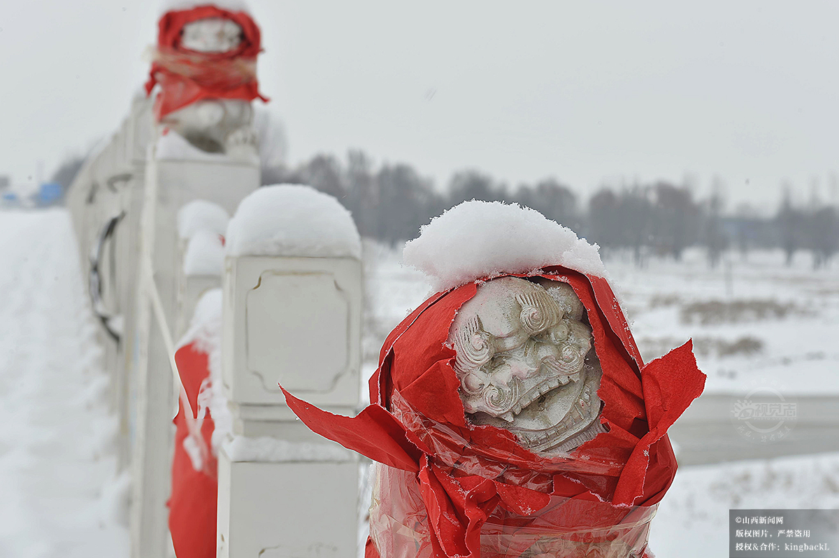 12月12日,拍摄于定襄县滹沱河森林公园滹沱河大桥。石狮披雪,静默守护着冬季的河流。山西新闻网特约摄影师:班建勇