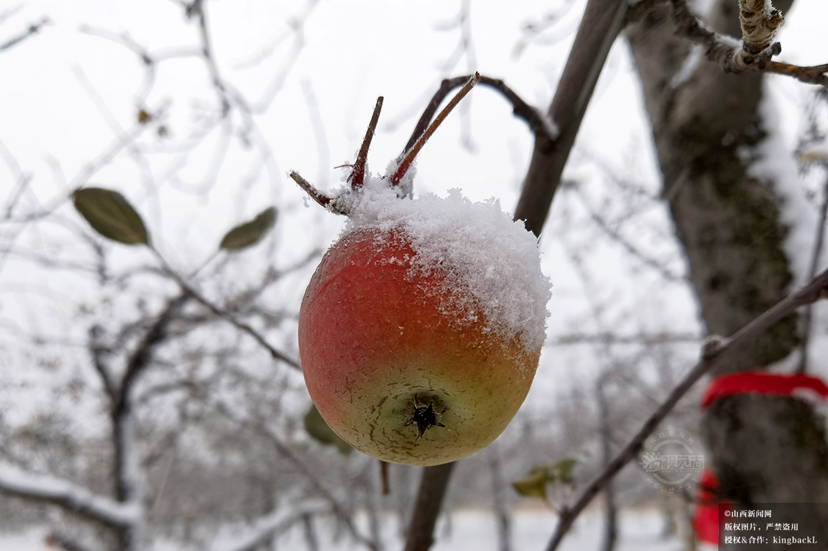 12月12日,拍摄于稷山县,田间苹果挂雪,展现“瑞雪兆丰年”的农耕图景。山西新闻网特约摄影师:史云平