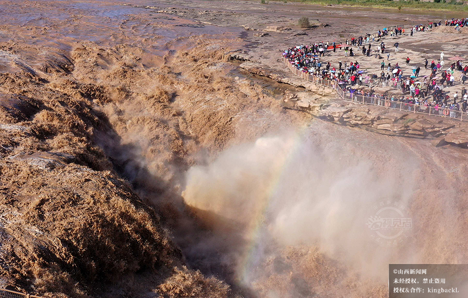 9月23日,金秋时节,受上游降雨和水库调节放水影响,临汾市吉县黄河壶口瀑布水量大增,壮美奔腾景象吸引了众多游客。©山西新闻网 发|吕桂明 摄