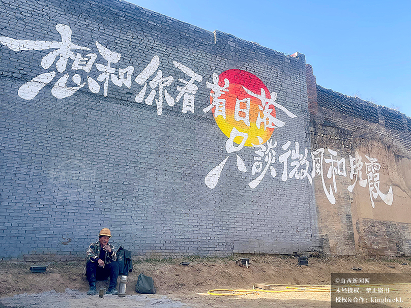 11月23日,张壁古堡墙绘“想和你看日落”旁,休憩工人与之相映。烟火与诗意碰撞,成温柔一景。©山西新闻网 发|特约摄影师 周利平
