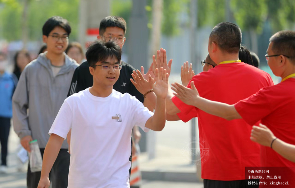 6月7日,2025年高考启幕,长治市武乡中学考点,老师身穿红色战袍,寓意“开门红”,与考生暖心击掌,为逐梦学子加油。©山西新闻网 发|特约摄影师 李勇