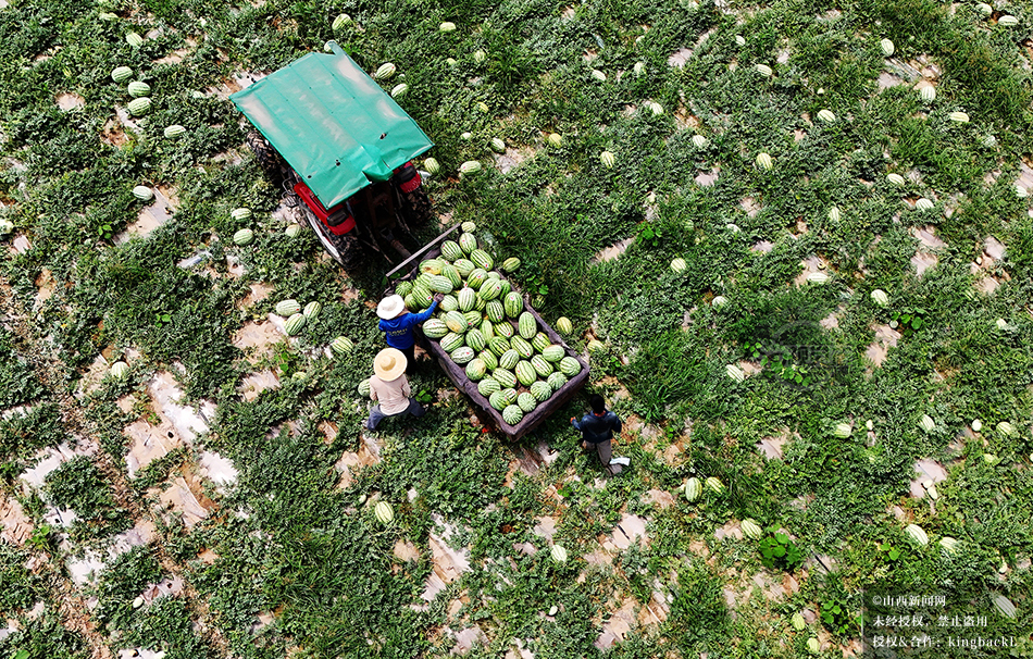 6月22日,运城市万荣县黄河滩5000余亩良种西瓜丰收。村民正忙着采摘、搬运、装车,现场一派喜人的繁忙景象。©山西新闻网 发|张怀心 摄