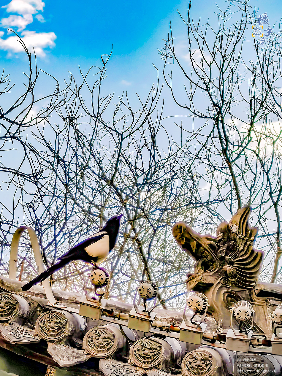 12月28日,太原一公园内,喜鹊落于古建筑檐角,枯枝疏影衬着淡蓝天幕,清脆鸟叫裹着冬日清宁,古意与生机在晨间悄然相融。©山西新闻网 发|臧佳 摄