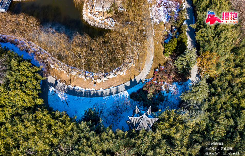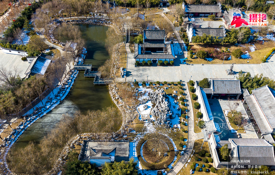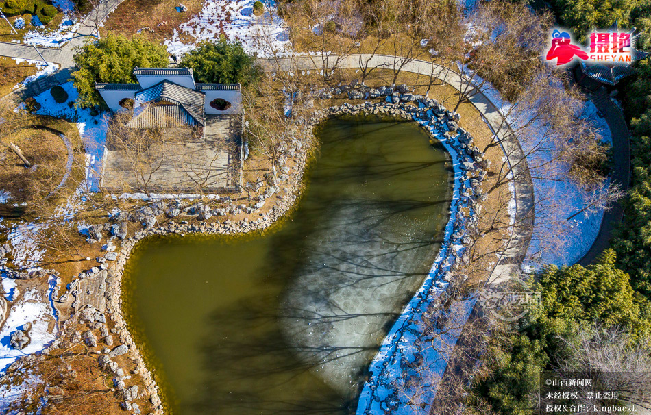 1月11日,摄影师航拍冬日曲沃顾园。园内仿明清建筑青瓦白墙,覆着薄雪,与残冰、枯树构成一幅素雅清幽的画卷。作为一座爱国主义主题公园,顾园以“江南风格、南北兼融”为基调,“一湖一山一台一桥”错落有致,亭榭院落兼具徽派婉约与北方端庄。园中翠竹傲寒挺立,林木覆雪,顾炎武塑像静立其间,在冬日的疏朗中更显文脉沉厚、意境深远。©山西新闻网 发|特约摄影师 张跟慧