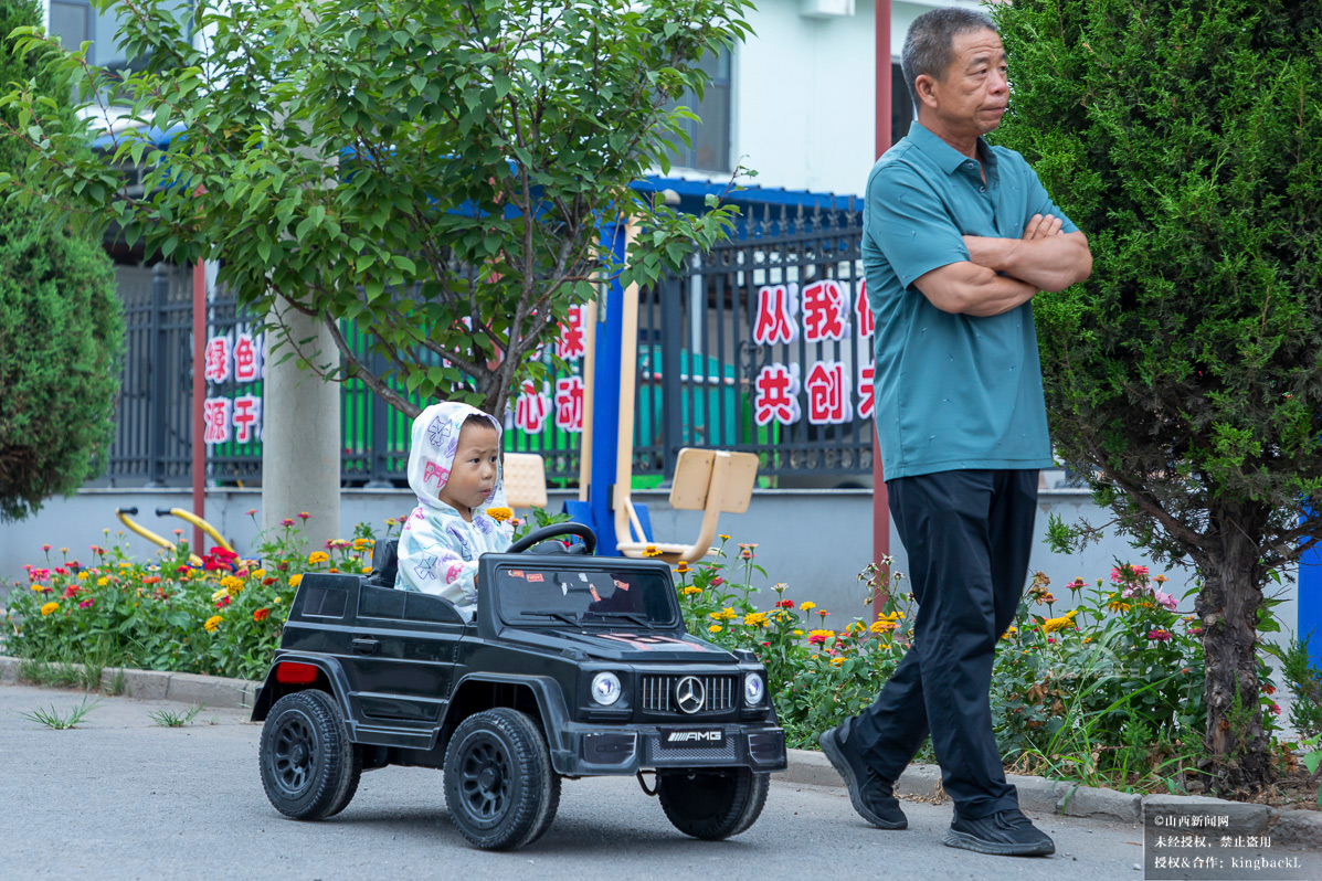 侯堡镇南垴上村,一位老人陪伴孩童驾驶玩具车出行。当地通过“龙头企业+合作社+基地+农户”模式,带动365户脱贫户和监测对象稳定增收,户均年增收约3000元,让群众日子越过越有底气。