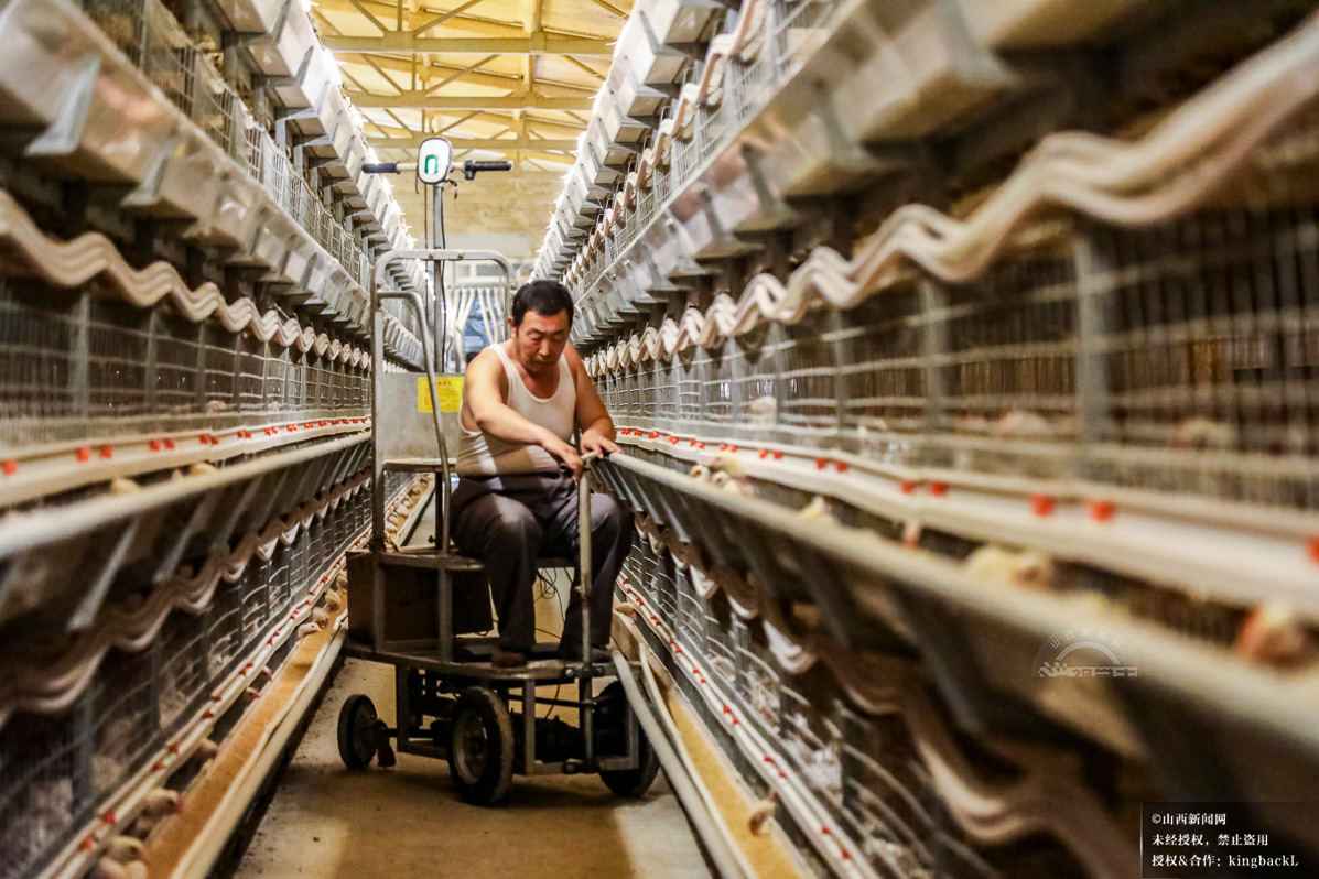 下良镇“8+7”联建模式下的智慧养鸡场内,养殖户驾驶巡检车穿梭于自动化鸡笼间。该项目整合7个村力量建设,年收益达30万元,带动村民共享发展红利。