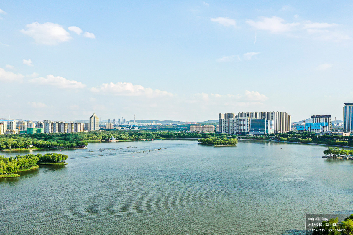 襄垣县城东湖畔,碧水蓝天与现代楼宇相映成画。该县统筹城乡发展,以县城为核心辐射乡村,推动产业、人才、资源双向流动,助力乡村全面振兴。