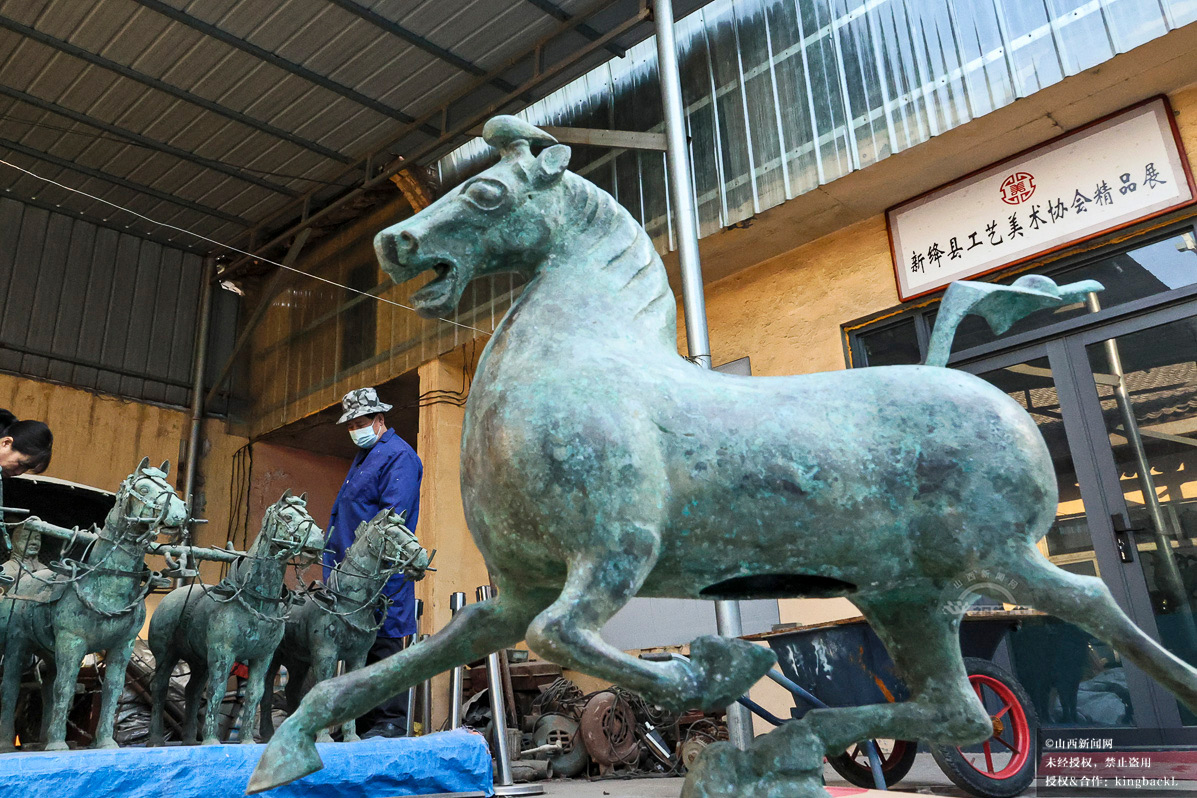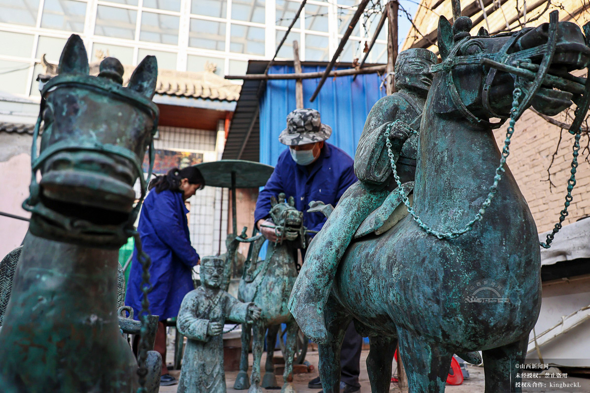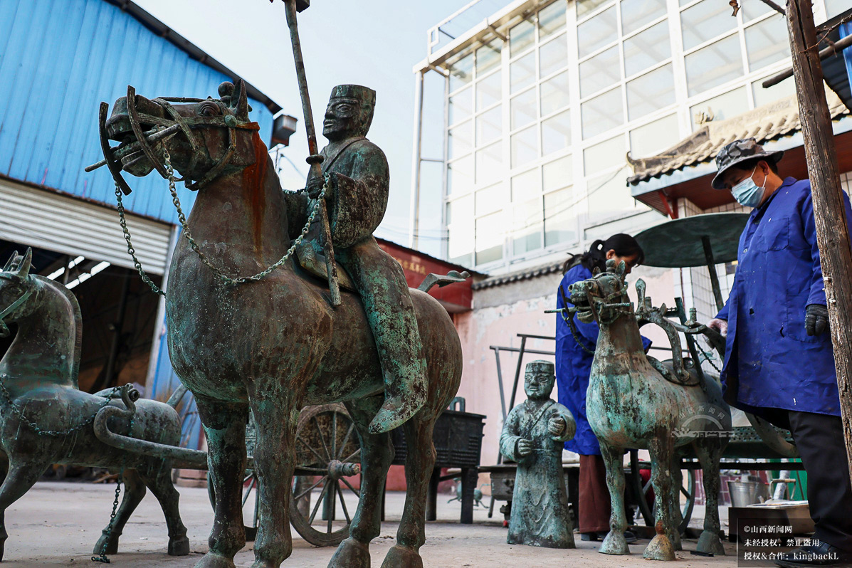 作坊一角,多件青铜战马半成品有序摆放,工艺师穿梭其间进行打磨。新绛县以“龙头企业+传承人+工匠”的模式深耕非遗传承,让青铜制作这一古老技艺在新时代焕发新生机。