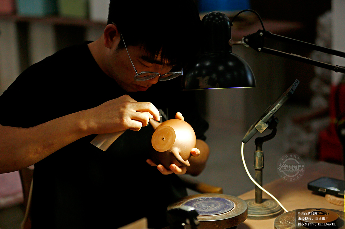 乡宁紫砂雕刻多以吉祥纹样、山水花鸟为题材,匠人手持竹刀或钢刀,运刀稳健,或浮雕、或刻绘,纹饰需与壶型浑然一体,既添美学价值,又不破坏壶身结构。雕刻完成后再经精细打磨,让壶身触感温润细腻,去除所有毛刺棱角,使器型更显端庄雅致。
