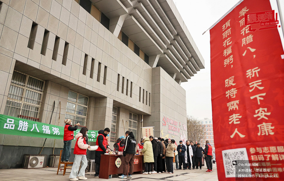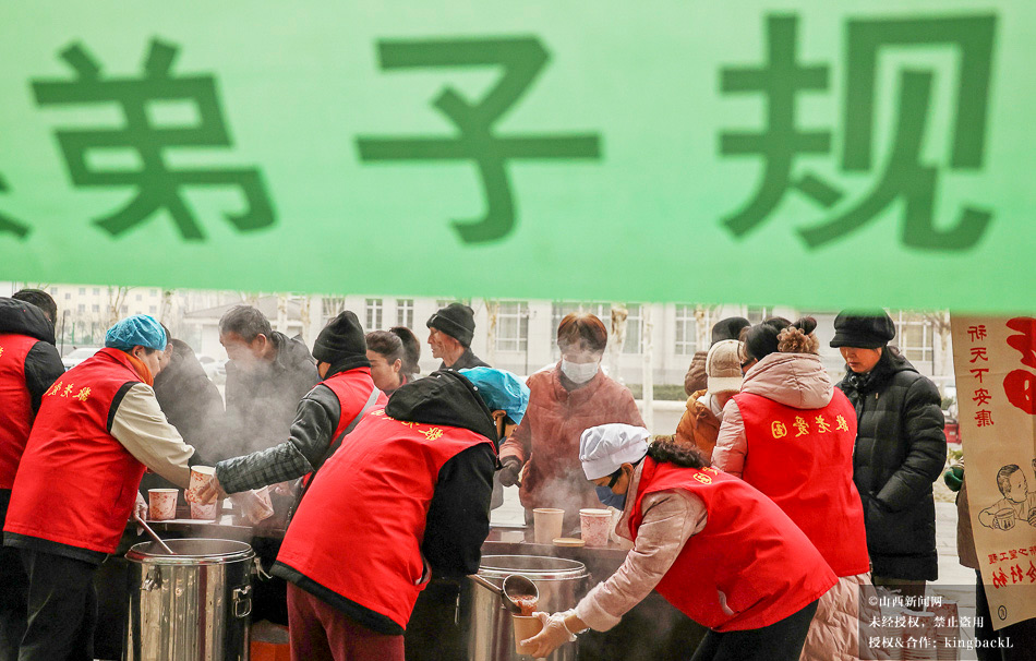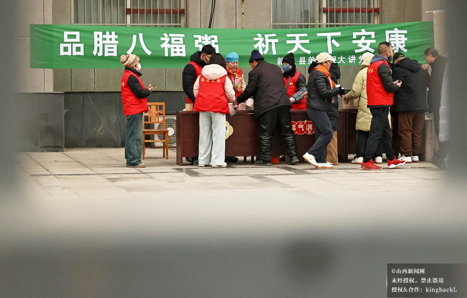 1月25日,腊八节将至,在运城市新绛县古城绛州体育馆前,当地《弟子规》大讲堂志愿者开展的“品腊八福粥祈天下安康”免费送粥志愿活动进入第二天,为晨练市民、环卫工人等送上400多碗腊八粥。此次为期三天的活动,还将为孤儿院、敬老院等群体敬送近2000碗暖心腊八粥。©山西新闻网 发|高新生 摄