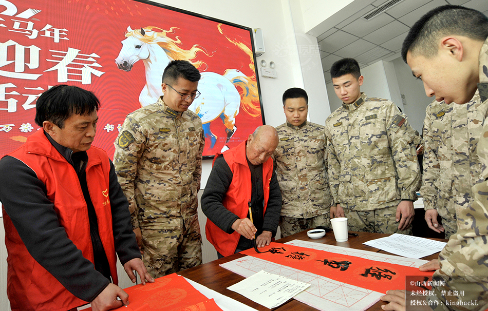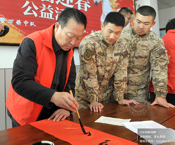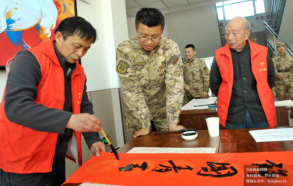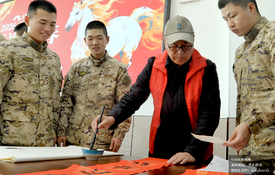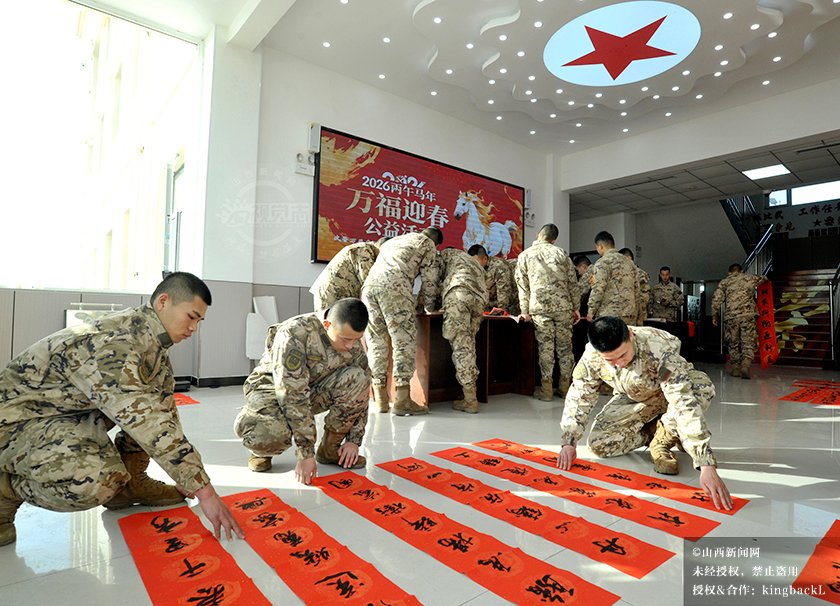1月26日,农历腊月初八,万荣县文联、县书法家协会走进驻地武警中队开展“万福迎新春”公益活动。书法家们现场挥毫泼墨,为官兵书写春联、福字、条幅,官兵们或帮忙压纸晾联,或驻足观看学习,墨香与欢笑交织,为警营增添了浓浓的年味,也让警民鱼水情在腊八时节更显温暖。©山西新闻网 发|张怀心 摄