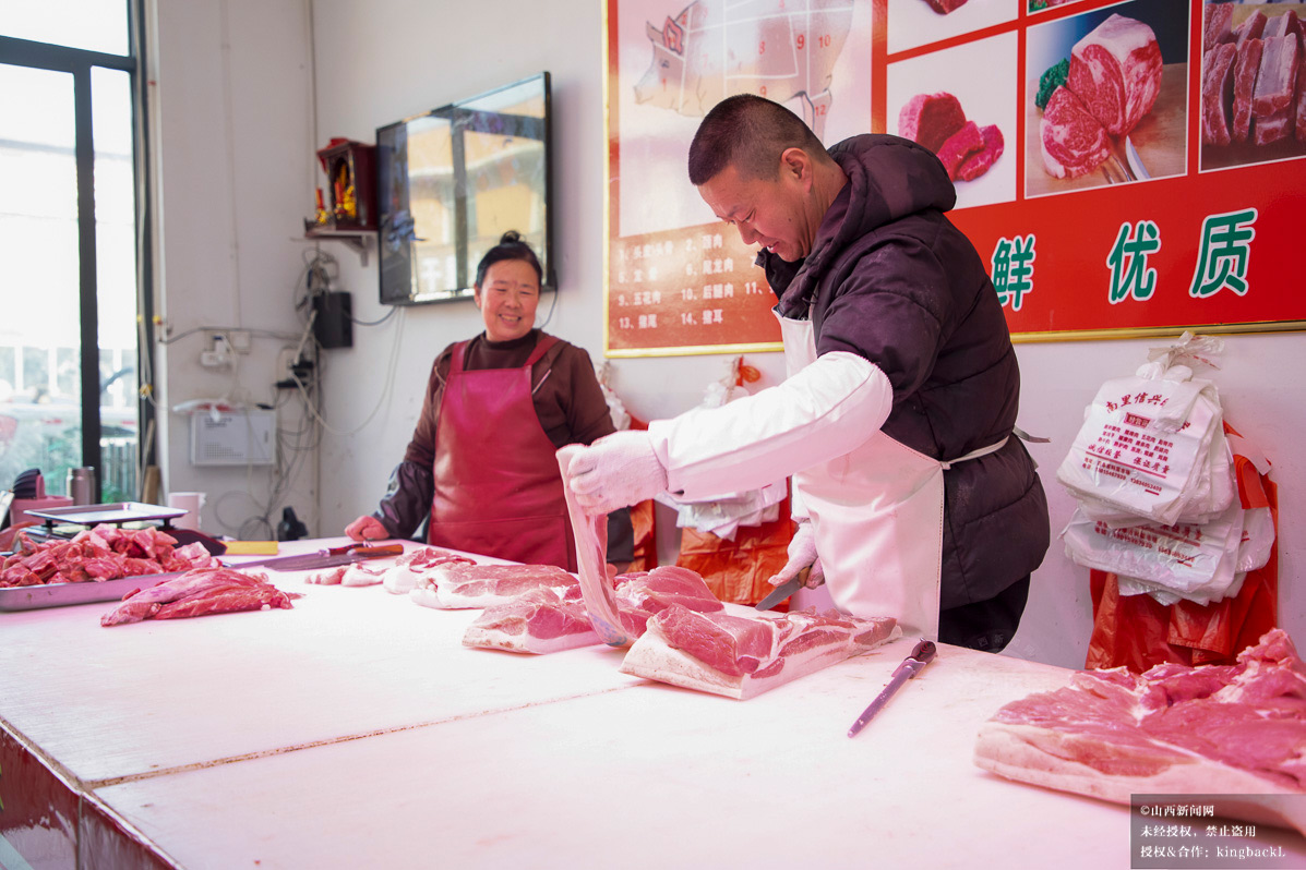 市场肉铺前,商户快手分切猪肉,案板上的鲜肉新鲜诱人,老板娘热情招呼顾客,阵阵吆喝声添浓市井暖意。