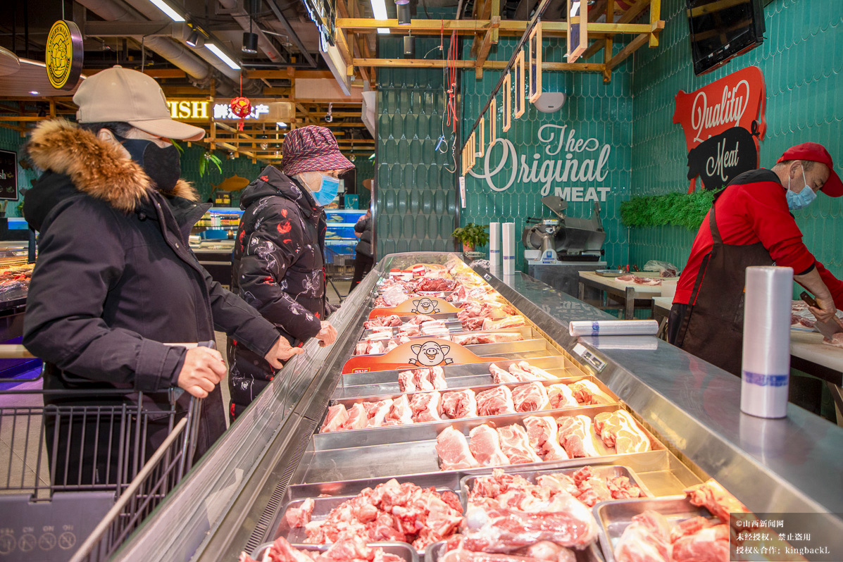 鲜肉柜台前,肋排、五花肉等新鲜肉类码放整齐,商户麻利地为顾客称重打包,刀起刀落间满足着市民的餐桌需求。