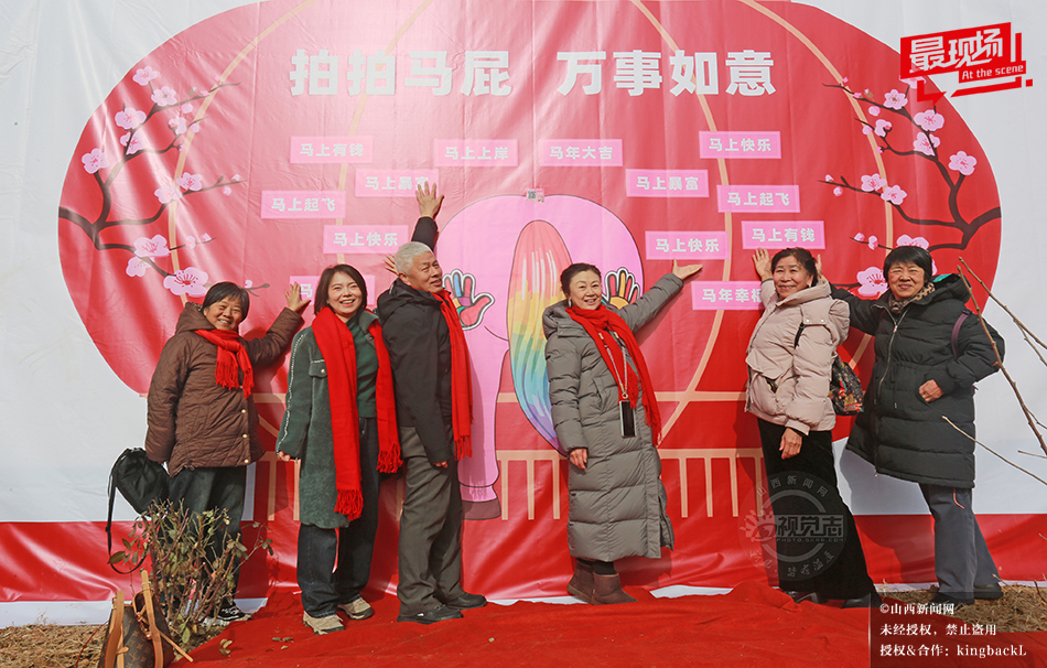 1月26日,腊八节,临汾市襄汾县景村柿子山庄热闹非凡。“千人共食腊八粥”活动火热开展,群众与志愿者在“拍拍马屁 万事如意”文创墙前打卡留念。墙面上“马上有钱”等马年吉祥语,寄托民众美好期盼。临汾各地马主题文创产品竞相推出,奏响马年新春幸福序曲。©山西新闻网 发|特约摄影师 王辉耀